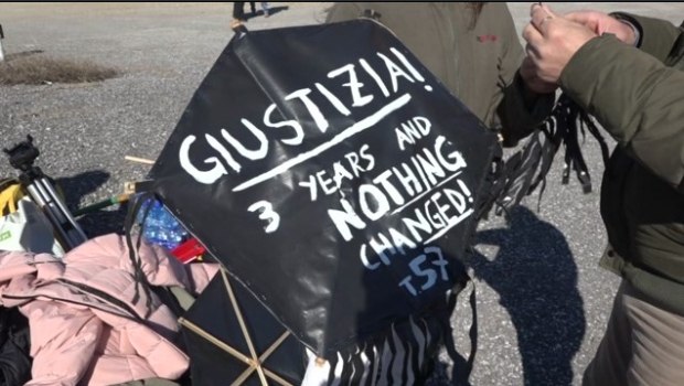 Στο συρματόπλεγμα, κρέμασαν μαύρους χαρταετούς και πανό με το σύνθημα «δικαίωση» σε κάθε γλώσσα.