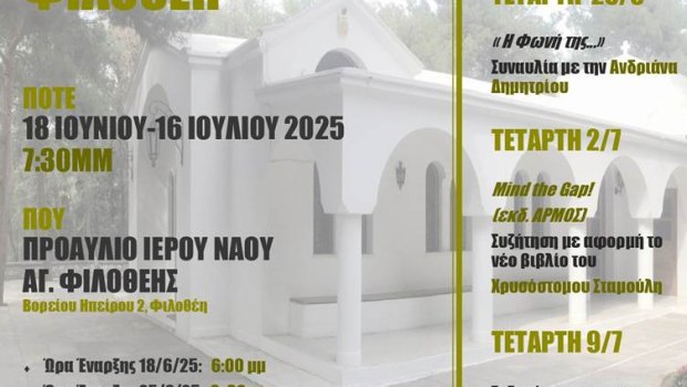 Ο Ιερός Ναός Αγίας Φιλοθέης του Δήμου Φιλοθέης-Ψυχικού και η Πρωτοβουλία για την Πρόληψη της Ενδοοικογενειακής βίας του Ιδρύματος Νεότητος & Οικογένειας της Ιεράς Αρχιεπισκοπής Αθηνών διοργανώνουν Τετάρτες Πολιτισμού στον προαύλιο χώρο του Ιερού Ναού, από τις 18 Ιουνίου έως τις 16 Ιουλίου 2025.
