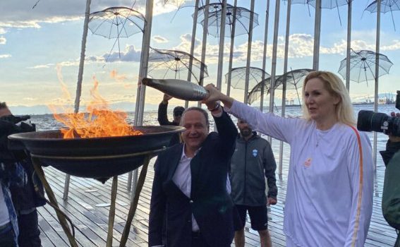 Η λαμπαδηδρόμος και Ολυμπιονίκης, κ. Τασούλα Κελεσίδου, άναψε την Ολυμπιακή Φλόγα μαζί με τον δήμαρχο Θεσσαλονίκης, κ. Στέλιο Αγγελούδη, δίπλα από τις εμβληματικές Ομπρέλες της Θεσσαλονίκης και με το πλήθος να ξεσπά σε χειροκροτήματα.