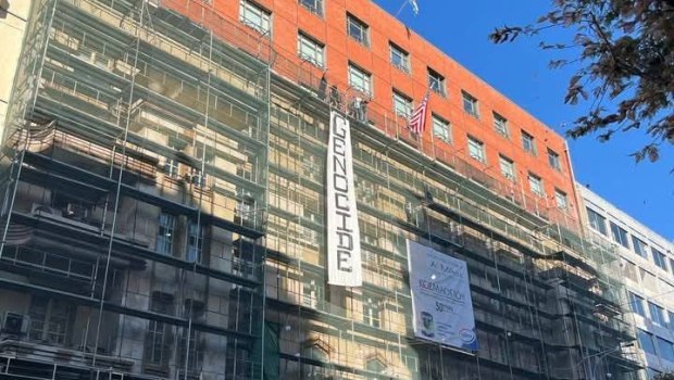 Τα μέλη της αναρχικής συλλογικότητας κρέμασαν γιγαντοπανό για την γενοκτονία στην Παλαιστίνη.