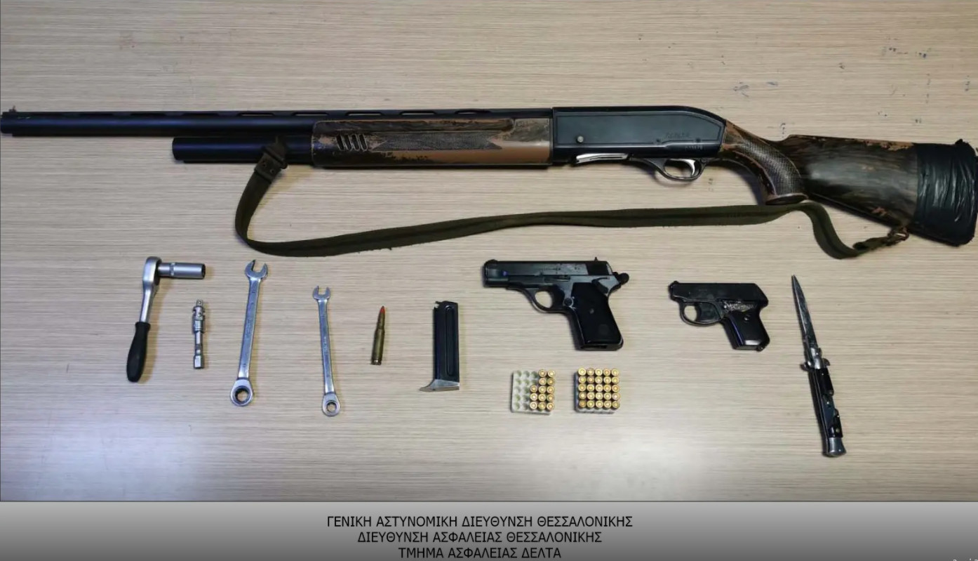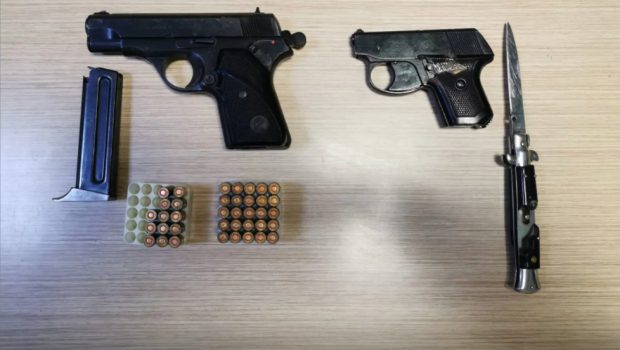 Σε έρευνα που ακολούθησε στην οικία του 38χρονου βρέθηκαν και κατασχέθηκαν ένα πιστόλι με γεμιστήρα των 8 φυσιγγίων, ένα πιστόλι άνευ αριθμού, 30 φυσίγγια, ένα φυσίγγιο πολεμικού όπλου, ένα μαχαίρι – αναδιπλούμενο (στιλέτο) και μία κυνηγετική καραμπίνα.