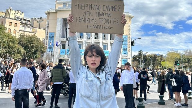Παρελαύνοντας στη Θεσσαλονίκη, κρατούσε ένα πλακάτ που ανέγραφε «υπερήφανοι Έλληνες δεν τιμούν εθνικούς προδότες. Τέμπη 2023».