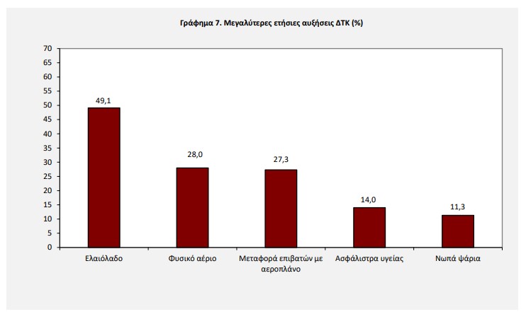 Σε ό,τι αφορά τα ξεχωριστά προϊόντα και υπηρεσίες την μεγαλύτερη ετήσια αύξηση τιμών καταγράφει για έναν ακόμη μήνα το ελαιόλαδο με άνοδο 49,1%. Σημαντική διψήφια άνοδο τιμών σημειώνει το φυσικό αέριο (+28%) και ακολουθούν: η μεταφορά επιβατών με αεροπλάνο (27,3%), τα ασφάλιστρα υγείας (14%) και τα νωπά ψάρια (+11,3%).
