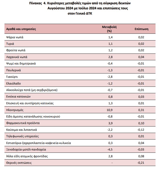 Σε μηνιαία βάση (σύγκριση με τον Ιούλιο), τη μεγαλύτερη αύξηση σημείωσαν οι τιμές του ρεύματος (10,9%) και μετά οι τιμές των φαρμακευτικών προϊόντων (3,9%) και των νωπών λαχανικών (2,8%).