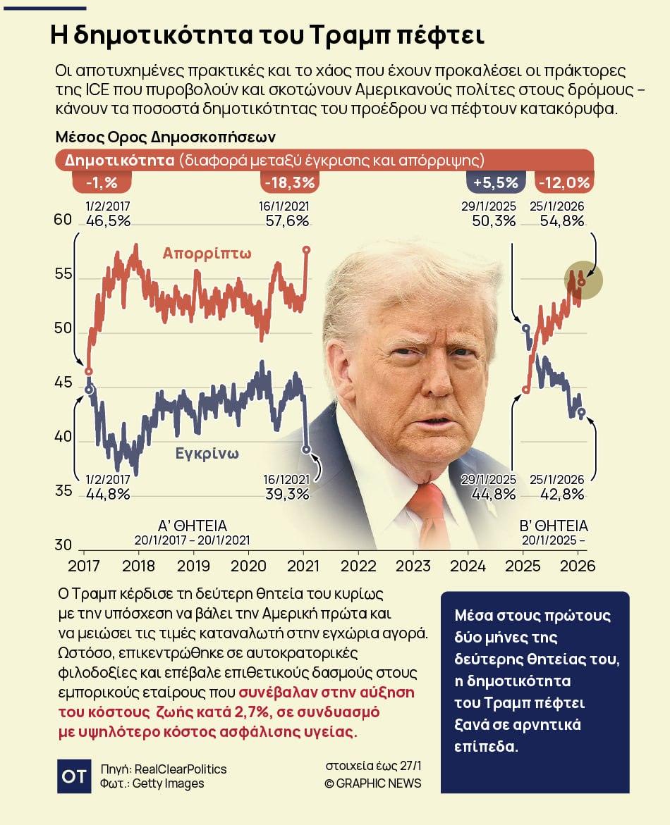 Καθώς οι δημοσκοπήσεις καταγράφουν ένα σταθερό προβάδισμα της απόρριψης έναντι της αποδοχής, ο Αμερικανός πρόεδρος βλέπει το αφήγημα της «ισχυρής ηγεσίας» να ραγίζει από το βάρος των πραγματικών επιπτώσεων των επιλογών του — από τη βία που αποδίδεται στο ICE και τις ανεκπλήρωτες υποσχέσεις για φθηνότερη καθημερινότητα, μέχρι τους δασμούς και τις αμφιλεγόμενες διεθνείς παρεμβάσεις. Η πολιτική του παραμένει θορυβώδης – η δημοτικότητά του, όμως, υποχωρεί σιωπηλά.
