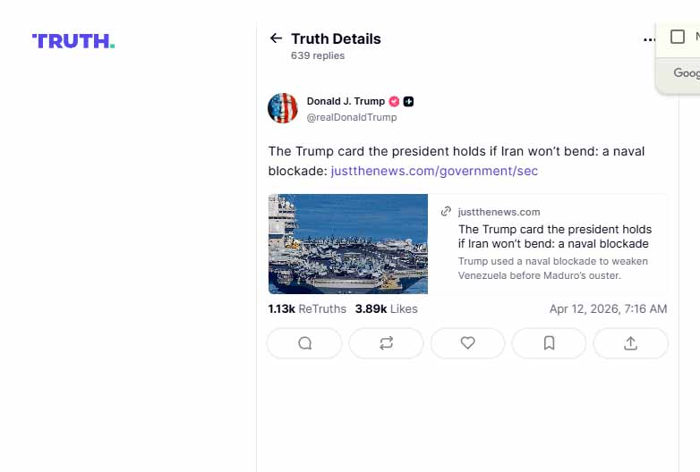«Το χαρτί Τραμπ αν το Ιράν δεν υποχωρήσει: ένας ναυτικός αποκλεισμός», είναι ο τίτλος ενός άρθρου που αναδημοσίευσε ο Ντόναλντ Τραμπ στον προσωπικό του λογαριασμό στο Truth Social.
