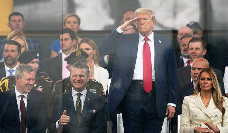 Ο Ντόναλντ Τραμπ ήταν εμφανώς περιχαρής παρακολουθώντας τη μεγάλη στρατιωτική παρέλαση που ονειρευόταν, η οποία έγινε το Σάββατο, 14 Ιουνίου, στην Ουάσιγκτον, με φόντο πελώριες διαδηλώσεις εναντίον της πολιτικής του σε άλλες πόλεις, σε όλες τις ΗΠΑ.