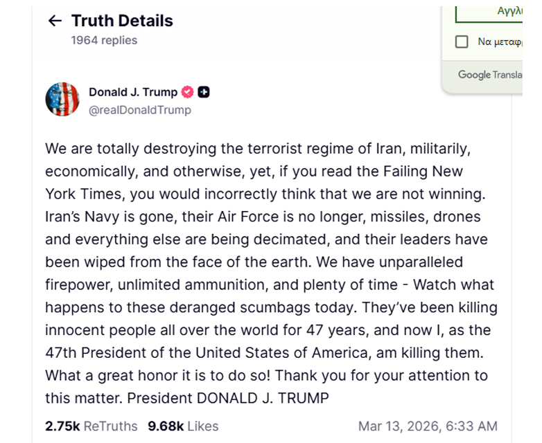 «Το ναυτικό του Ιράν έχει εξαφανιστεί, η αεροπορία του δεν υπάρχει πια, οι πύραυλοι, τα drones και όλα τα άλλα έχουν καταστραφεί, και οι ηγέτες του έχουν εξαφανιστεί από προσώπου γης. Διαθέτουμε ασύγκριτη δύναμη πυρός, απεριόριστα πυρομαχικά και άφθονο χρόνο. Παρακολουθήστε τι θα συμβεί σήμερα σε αυτά τα παρανοϊκά καθάρματα. Σκοτώνουν αθώους ανθρώπους σε όλο τον κόσμο εδώ και 47 χρόνια, και τώρα εγώ, ως 47ος Πρόεδρος των Ηνωμένων Πολιτειών της Αμερικής, τους σκοτώνω. Τι μεγάλη τιμή είναι να το κάνω αυτό!», ανέφερε ο ίδιος.