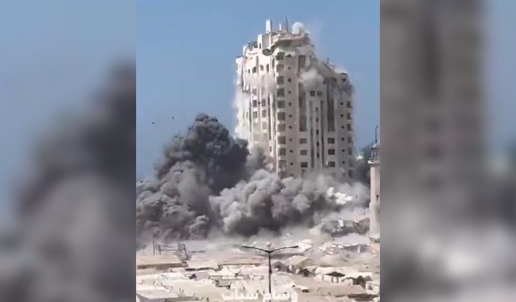 Zionist regime warplanes have just demolished Gaza City’s Mushtaha Tower, forcing hundreds of nearby displaced families who had sought refuge on its grounds to evacuate their tents and flee once more. pic.twitter.com/dAxKCDDhsY