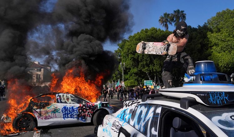 Η αστυνομία της αμερικανικής μεγαλούπολης χαρακτήρισε κάποιες συγκεντρώσεις «παράνομες», ισχυριζόμενη ότι οι διαδηλωτές πέταξαν κομμάτια τσιμέντου, μπουκάλια και άλλα αντικείμενα στην αστυνομία. Πολλά αυτοκινούμενα οχήματα της υπηρεσίας ταξί Waymo πυρπολήθηκαν σε κεντρικό δρόμο του Λος Άντζελες χθες το βράδυ, σύμφωνα με εικόνες από βίντεο.
