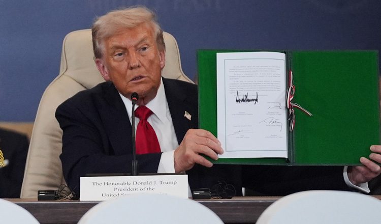 «Εμείς, οι υπογεγραμμένοι, καλωσορίζουμε τη πραγματικά ιστορική δέσμευση και την εφαρμογή από όλες τις πλευρές της Ειρηνευτικής Συμφωνίας Τραμπ, η οποία έθεσε τέλος σε περισσότερα από δύο χρόνια βαθιάς οδύνης και απωλειών — ανοίγοντας ένα νέο κεφάλαιο για την περιοχή, που ορίζεται από την ελπίδα, την ασφάλεια και ένα κοινό όραμα για ειρήνη και ευημερία.