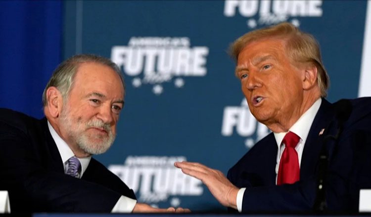 Ο Μάικ Χάκαμπι με τον Ντόναλντ Τραμπ, σε προεκλογική εκδήλωση στην Πενσυλβάνια, τον Οκτώβριο 2024. Πίστωση: Julia Demaree Nikhinson/AP