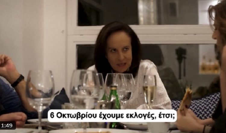Η ίδια βρίσκεται να γευματίζει με συνδαιτημόνες τον Σταμάτη Φασουλή, τη Δήμητρα Παπαδοπούλου, τον Σπύρο Παπαδόπουλο και τον Γιάννη Μπέζο.