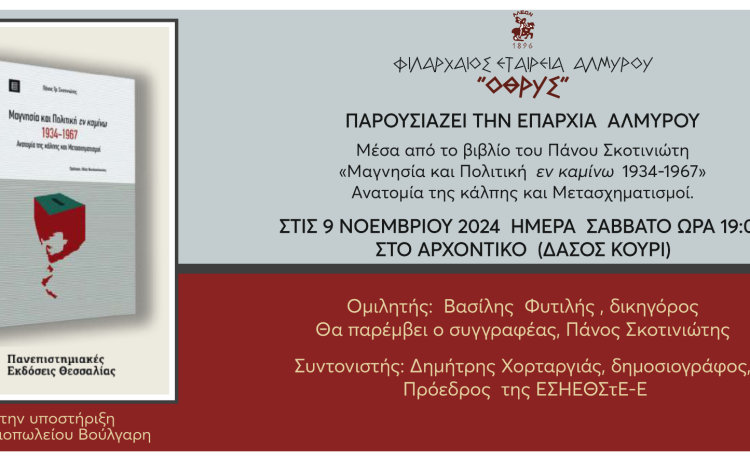 Το βιβλίο του Πάνου Σκοτινιώτη “Μαγνησία και Πολιτική εν καμίνω, 1934-1967” θα παρουσιάσει η Φιλάρχαιος Εταιρεία Αλμυρού “‘Οθρυς”, το Σάββατο 9 Νοεμβρίου 2024, ώρα 19.00, στο «ΑΡΧΟΝΤΙΚΟ» (δάσος Κουρί).