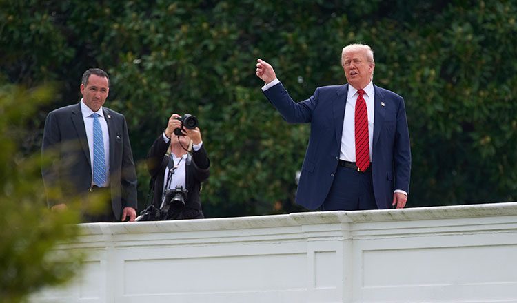 Ο Τραμπ πλαισιωνόταν από τους σωματοφύλακες του και άλλους, συμπεριλαμβανομένου του Τζέιμς ΜακΚρίρι, του αρχιτέκτονα του έργου της αίθουσας χορού του Λευκού Οίκου, αξίας 200 εκατομμυρίων δολαρίων.