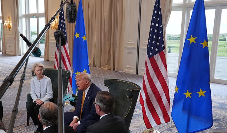 Ο Τραμπ έκανε αυτή τη δήλωση κατά την έναρξη της συνάντησής του με την πρόεδρο της Ευρωπαϊκής Επιτροπής Ούρσουλα φον ντερ Λάιεν στο πολυτελές γήπεδο γκολφ της οικογένειάς του, στο Τέρνμπερι της δυτικής Σκωτίας. Σημείωσε ότι το κυριότερο θέμα μεταξύ των δύο πλευρών είναι η «δικαιοσύνη», επισημαίνοντας τους φραγμούς στις εξαγωγές αυτοκινήτων και αγροτικών προϊόντων από τις ΗΠΑ προς την ΕΕ. «Η ευρωπαϊκή αγορά είναι πολύ κλειστή», σχολίασε.
