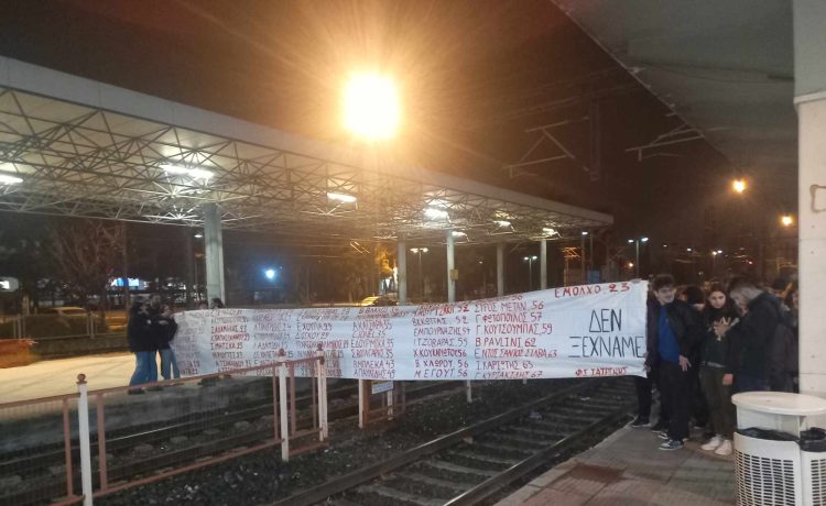 Φοιτητές της Ιατρικής Λάρισας απέκλεισαν τις σιδηροδρομικές γραμμές στον σταθμό του ΟΣΕ στη Λάρισα, για 57 λεπτά, φώναξαν τα ονόματα των θυμάτων και κάλεσαν τον κόσμο να συμμετέχει αύριο στην απεργιακή συγκέντρωση.