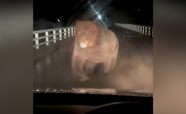 Στις συγκλονιστικές εικόνες διακρίνεται η πελώρια αρκούδα να κυνηγά το αυτοκίνητο ουρλιάζοντας και να πέφτει με τα μπροστινά της πόδια με δύναμη στο καπό του αυτοκινήτου, βυθίζοντας τα νύχια της, καθώς ο οδηγός κάνει όπισθεν στην προσπάθειά του να γλυτώσει.
