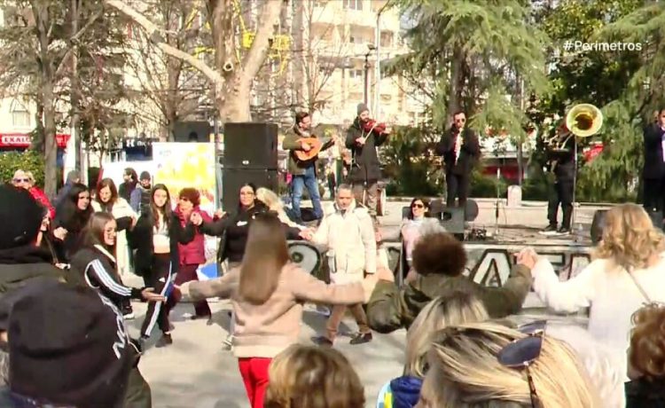 Στην κεντρική πλατεία η δημοσιογράφος Κωνσταντίνα Θεοχαρούλη, παρουσιάζει τους κατοίκους που περιμένουν για τα δωρεάν ψητά σουβλάκια, λουκάνικα και κρασί.
