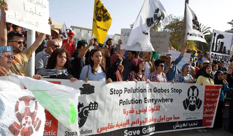 Χιλιάδες άνθρωποι βγήκαν και σήμερα στους δρόμους της παραθαλάσσιας πόλης Γκαμπές της Τυνησίας, συμμετέχοντας σε μια ογκώδη πορεία, καθώς κλιμακώνονται οι διαμαρτυρίες που ξεκίνησαν την περασμένη εβδομάδα για τη ρύπανση από την κρατική βιομηχανία φωσφορικού άλατος Chemical Group (CGT).