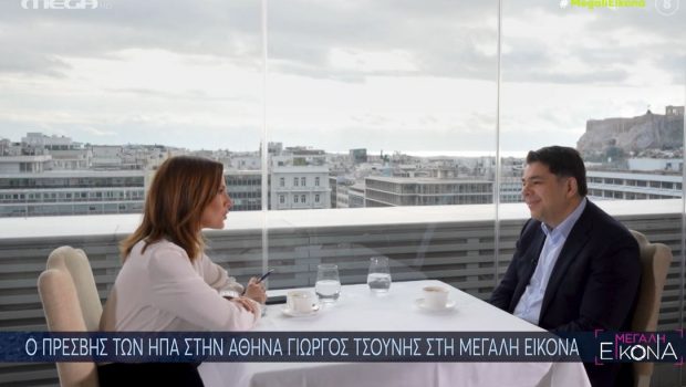 «Ήταν τα καλύτερα τρία χρόνια της ζωής μου» λέει ο Τζορτζ Τσούνης, πρέσβης των ΗΠΑ στην Ελλάδα, σε μια ειλικρινή και βαθιά ανθρώπινη συζήτηση με τη Νίκη Λυμπεράκη στην εκπομπή «Μεγάλη Εικόνα» στο MEGA.