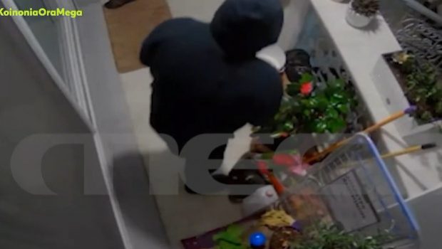 ‘Όπως φαίνεται στο βίντεο ντοκουμέντο του MEGA, ο πρώτος διαρρήκτης βολιδοσκοπεί το σημείο, και βεβαιώνεται πως κανείς δεν είναι στο σπίτι, παρά το γεγονός ότι η τηλεόραση αλλά και όλα τα φώτα ήταν ανοιχτά.