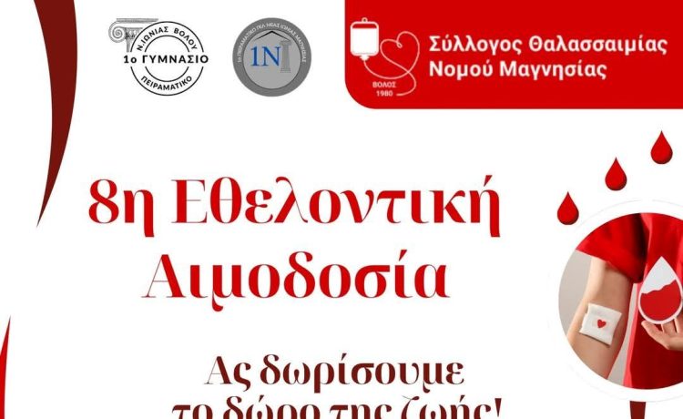 Με ένα μήνυμα αλληλεγγύης και προσφοράς, το 1ο Γυμνάσιο Νέας Ιωνίας – Πειραματικό και το 1ο Πειραματικό Γενικό Λύκειο Νέας Ιωνίας διοργανώνουν την 8η Εθελοντική Αιμοδοσία. Η δράση θα πραγματοποιηθεί την Τετάρτη 26 Φεβρουαρίου 2025, από τις 9:00 έως τις 13:00, στο σχολικό συγκρότημα (Φυτόκου-Π. Βουτσά-Παρασκευοπούλου), σε συνεργασία με τον Σύλλογο Θαλασσαιμίας και την Κινητή Μονάδα Αιμοληψίας της Ν.Υ. Αιμοδοσίας του Γενικού Νοσοκομείου Βόλου.