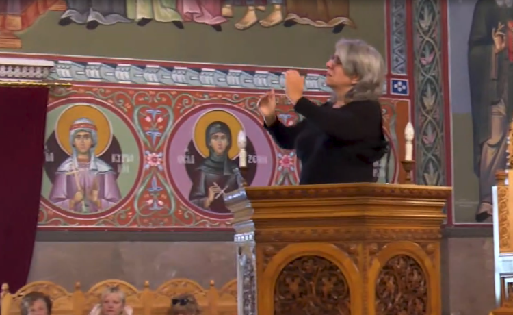 Η λειτουργία, που παρακολούθησαν περίπου 30 άτομα με προβλήματα ακοής αλλά και εκπαιδευόμενη στη νοηματική γλώσσα πραγματοποιήθηκε με διερμηνεία από την Επίκουρη Καθηγήτρια Γλωσσολογίας του Παιδαγωγικού Τμήματος Ειδικής Αγωγής του Πανεπιστημίου Θεσσαλίας, Γαλήνη Σαπουντζάκη, η οποία είναι και πιστοποιημένη διερμηνέας στη νοηματική.