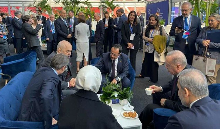 Ο Νίκος Χριστοδουλίδης και ο Ταγίπ Ερντογάν εισήλθαν ταυτόχρονα στην αίθουσα για τη Σύνοδο και ξεκίνησαν την ολιγόλεπτη συνομιλία τους παρουσία του Χακάν Φιντάν, λίγο πριν προσέλθουν στην ομήγυρη οι πρωθυπουργοί της Ελλάδας Κυριάκος Μητσοτάκης και της Αλβανίας Έντι Ράμα.