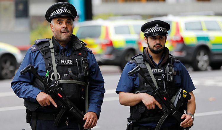 Κάποιοι από τους διαδηλωτές πέταξαν μπουκάλια και καπνογόνα εναντίον οχημάτων της αστυνομίας που είχαν κλείσει τον δρόμο προς το ξενοδοχείο, σύμφωνα με το βρετανικό πρακτορείο ειδήσεων PA Media.