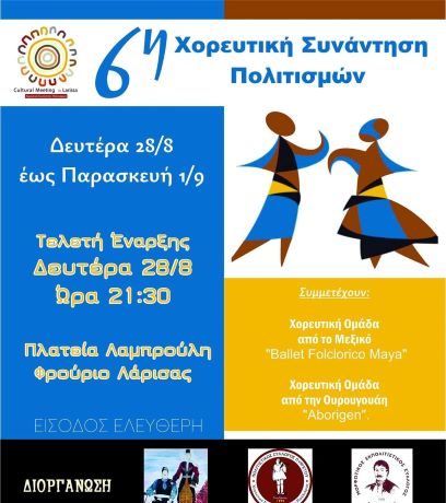 Ξεκινά την ερχόμενη Δευτέρα 28 Aυγούστου η 6η Χορευτική Συνάντηση Πολιτισμών, η οποία θα φιλοξενηθεί έως τις 31 του μηνός,  σε Λάρισα, Πυργετό, Συκούριο  και Χάλκη, με τη συμμετοχή Χορευτικών Ομάδων από την Ουρουγουάη και το Μεξικό.
